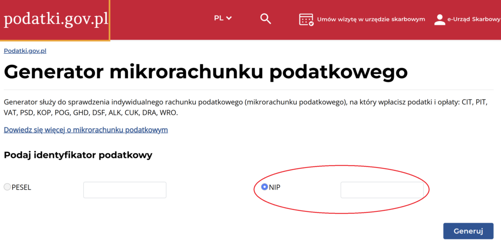Доступ к персональному налоговому счёту осуществляется через официальный портал podatki.gov.pl, где размещён круглосуточный генератор https://www.podatki.gov.pl/generator-mikrorachunku-podatkowego .